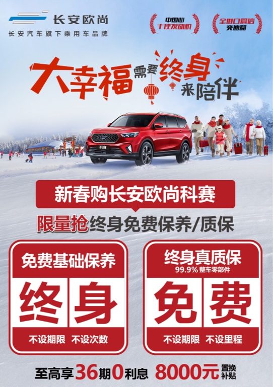而今天,新年伊始,长安欧尚官方就抛出了一大大棒-----在新春之际,长安欧尚汽车特别推出了“终身免费基础保养/保修”的双免的新春政策,也就是终身免费基础保养+终身免费真质保(99.9%零部件)。