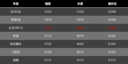 轴长比顾名思义即轴距与车身长度的比值。长安UNI-V的车身长宽高分别为4680mm、1838mm、1430mm,轴距长度为2750mm。