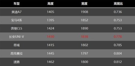 UNI-V在车身高度(1430mm)比同级别的思域(1415mm)多出不少的情况下,设计师通过将车身宽度提升到1838mm,让UNI-V最终达到了0.778的高宽比,与高档轿跑非常接近。