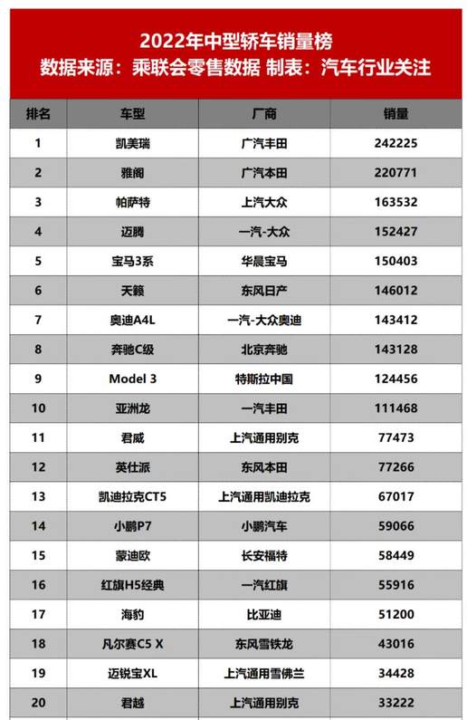 而根据乘联会零售数据统计,2022年B级轿车销量排行榜中,前十位被凯美瑞、雅阁、帕萨特、迈腾、宝马3系、天籁、奥迪A4L、奔驰C级、Model 3,亚洲龙夺得,而其中丰田、大众各有两款车型上榜,也说明了其在中国市场的出色地位,而别克君威却退出了前十,也说明了车市竞争之激烈。
