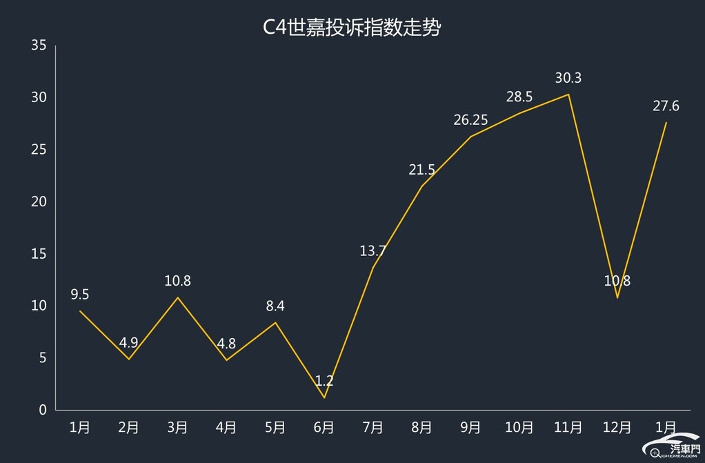 据汽车门网的投诉指数走势图显示,去年上半年,C4世嘉每月的投诉指数始终保持在较低水平。自从去年7月起,C4世嘉的投诉指数开始持续上升,并在去年11月达到峰值30.3。之后,在12月经历了短暂下跌后,又重新回到较高水平。