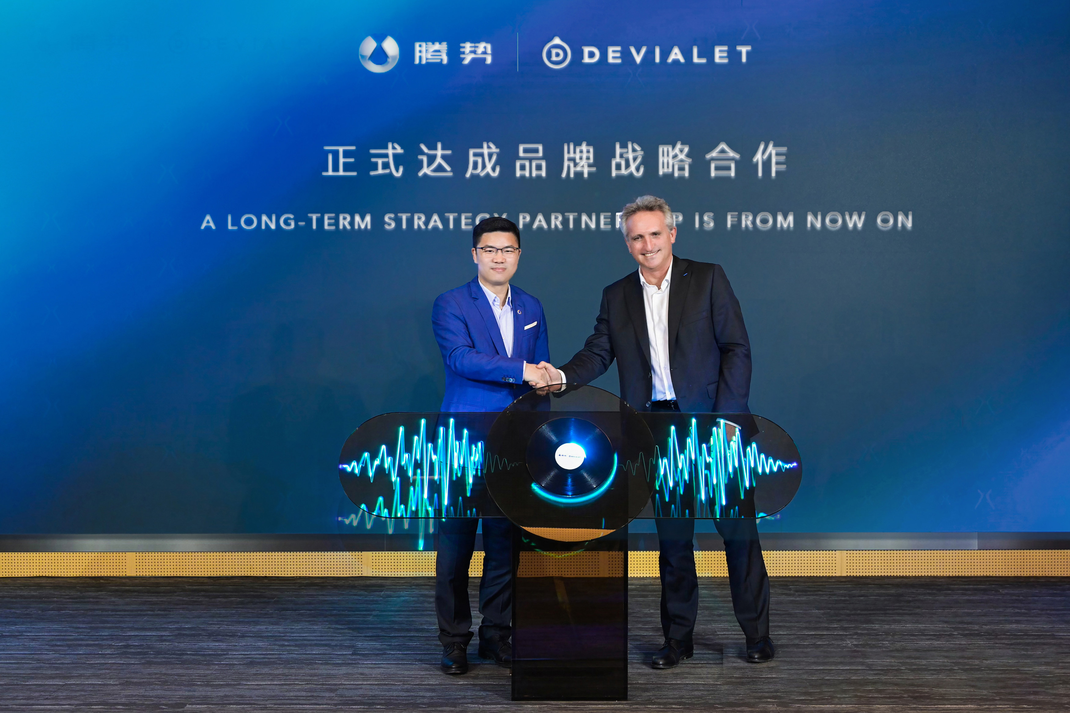 腾势汽车总经理赵长江(左)、DEVIALET帝瓦雷首席执行官 Franck Lebouchard(右)