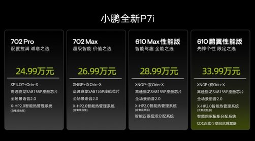 新款小鹏P7i的价格区间是24.99万-33.99万元,其中702Pro是性价比比较高的车型,虽然售价相比老款有一定的提升,但是像电吸门、前排座椅通风加热这种高配才有的配置也都下放到全系标配了,所以这一版本确实是性价比之选。其次就是702Max版本,相比于702Pro,实现了双Orin-X芯片,算力更强,但是相比于Max版,Max性能版再加2万元就能被配上智能四驱系统,要知道P7i四驱版零百加速只要3.9秒,在驾驶乐趣上还是Max性能版更强。