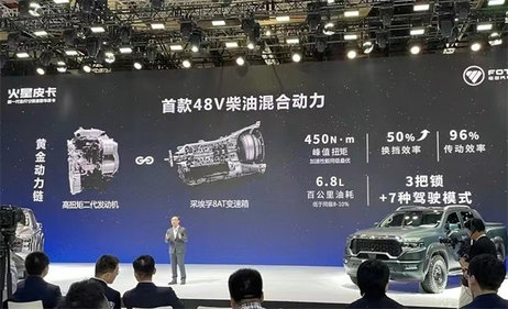 动力方面是福田皮卡的一大亮点,新车搭载全球首款48V柴油混合动力,匹配采埃孚8AT变速箱,中低速扭矩提升至220牛·米,峰值扭矩可达450牛·米。