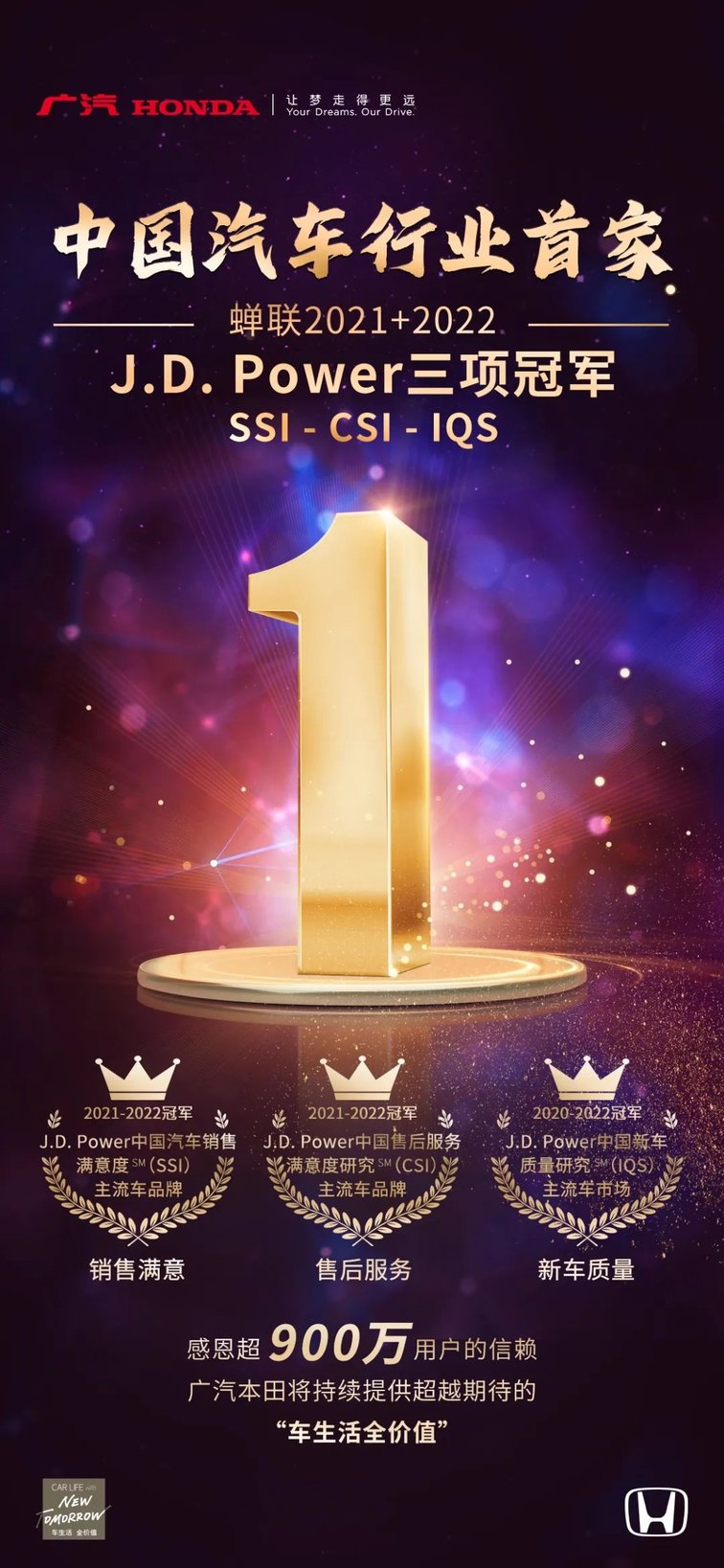 2022年J.D. Power中国汽车销售满意度SM(SSI)报告显示,广汽本田较上一年提升了15分,远高于同期行业平均分。在2022年J.D. Power中国售后服务满意度研究SM(CSI)榜单中,广汽本田以783分荣膺主流车品牌冠军,总分较之2021年提升了8分,满意度不断提升。未来,广汽本田将不断优化服务流程,为用户带来超越期待的选车、购车、用车体验,创造更多价值与喜悦。