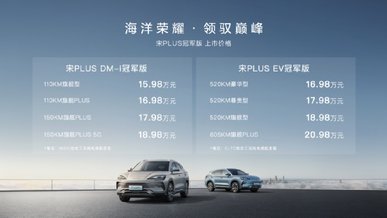 作为比亚迪旗下销量最好的SUV,宋PLUS迎来了冠军版的正式上市,其中宋PLUS DM-i冠军版共4款车型,售价15.98万元-18.98万元,宋PLUS EV冠军版共4款车型,售价16.98万元-20.98万元。
