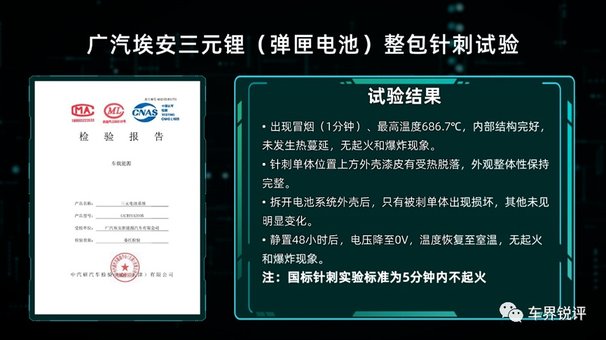话说,2021年3月10日,广汽埃安发布全球第一代弹匣电池系统安全技术,首次实现行业内三元锂电池整包针刺不起火,重新定义三元锂电池安全标准,获得行业内外的高度评价。