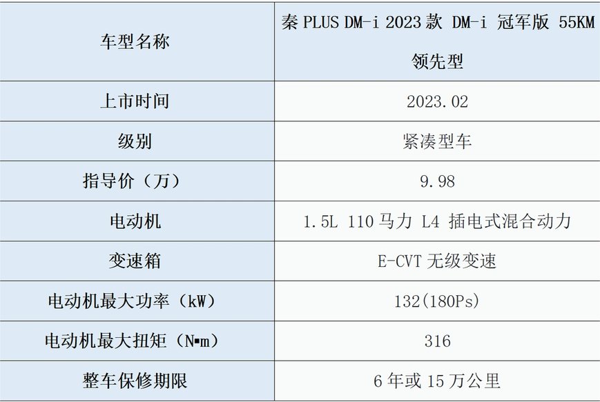 我们此次所试驾的版本为秦PLUS DM-i 2023款 DM-i 冠军版 55KM 领先型,搭载了1.5L自然吸气引擎+前置电动机的组合方式,发动机最大功率为81kw,峰值扭矩则为135牛米。电动车最大功率则为132kw,峰值扭矩也有316牛米。纯电续航里程有46km,慢充满电需要2.52小时。官方百公里加速时间7.9秒,能够应付日常的上下班中长距离通勤,而且WLTC综合油耗成绩在2.17L/100km,即使馈电下的燃料消耗量,也只有4.6L/100km。相比于纯燃油车还是有着较高的燃油经济性,且动力系统即时在线,起步急加速都能给予充分的操控信心。大家觉得9.98万元的官方起售价,能够接受吗?欢迎在下方评论区留言。