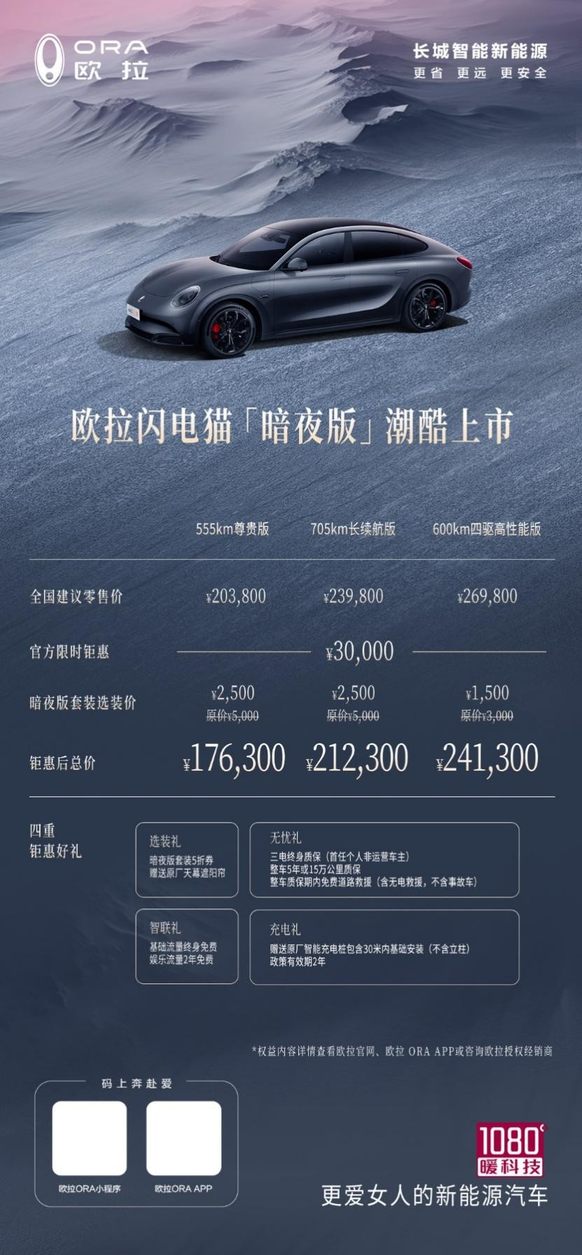 越夜越惊艳 欧拉闪电猫暗夜版上市 打造纯电轿跑新标杆