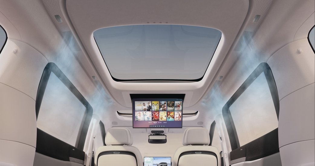 除了宽敞、自如的活动空间”和“灵活收纳的大沙发”,最能代表“家庭豪华舒适”的大冰箱、大彩电、大音响我们也一个不漏:X9配备行业首创的冷热一体式电动开闭冰箱,0-50℃宽泛调节,拥有同级领先的10.8L容积,可容纳8瓶570ml矿泉水。此外,更突破性地把“中央空调”装进了车里:X9将搭载微气候新风系统,全球首发环绕式静感柔风空调,6000+微孔环绕天幕,每一缕微风柔若无感,有温感,无风感,呵护老人孩子健康,不论季节,家的气候始终随你所变。