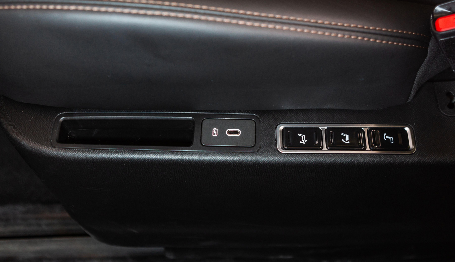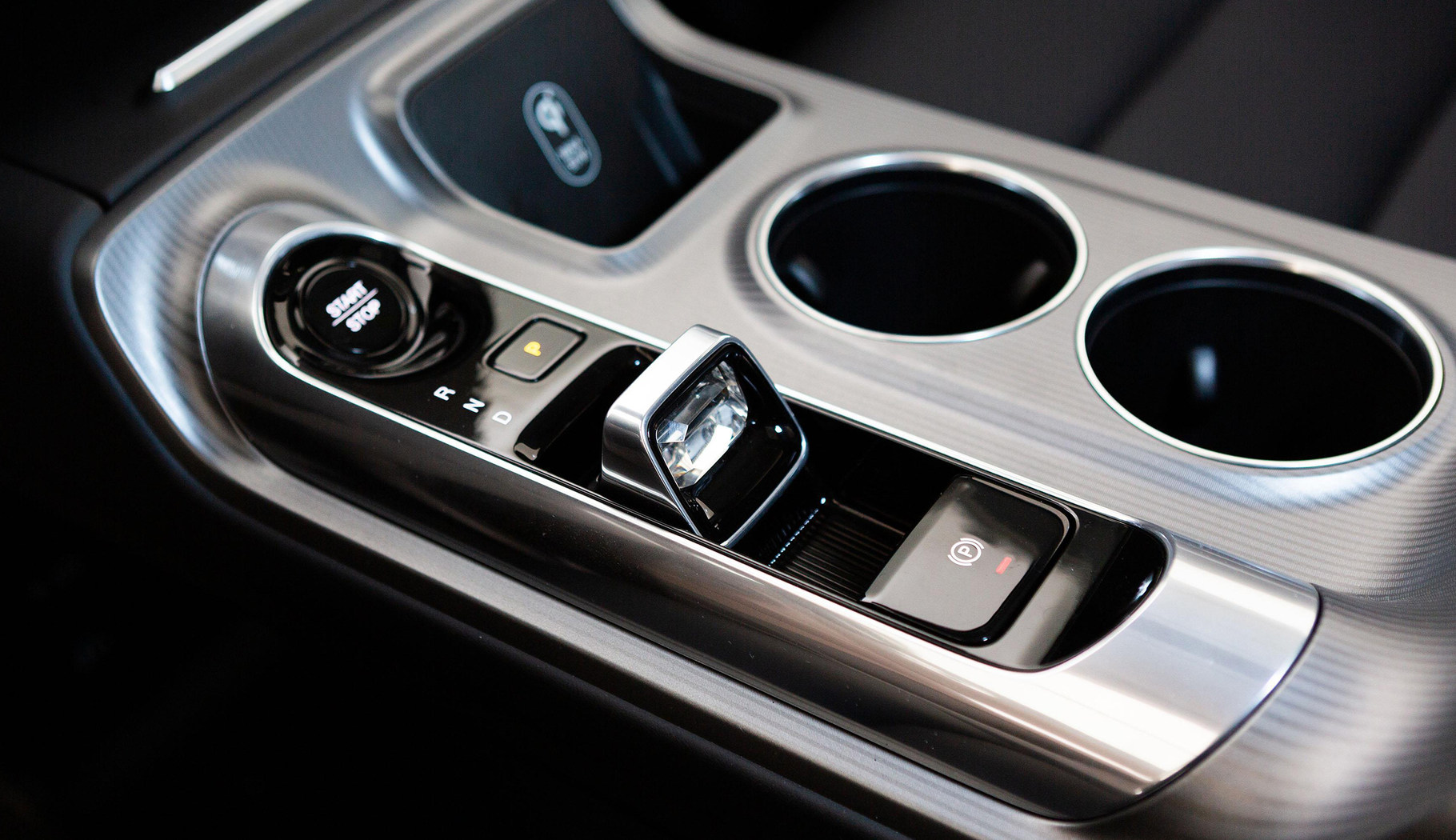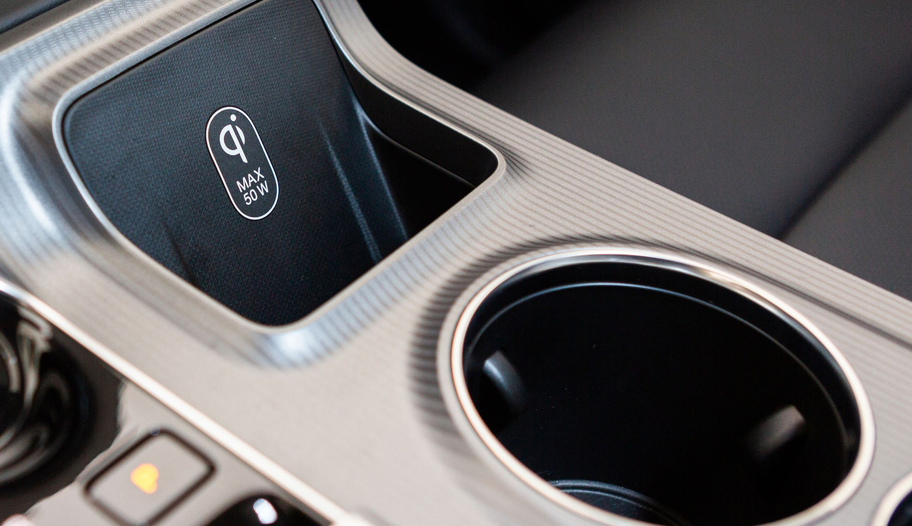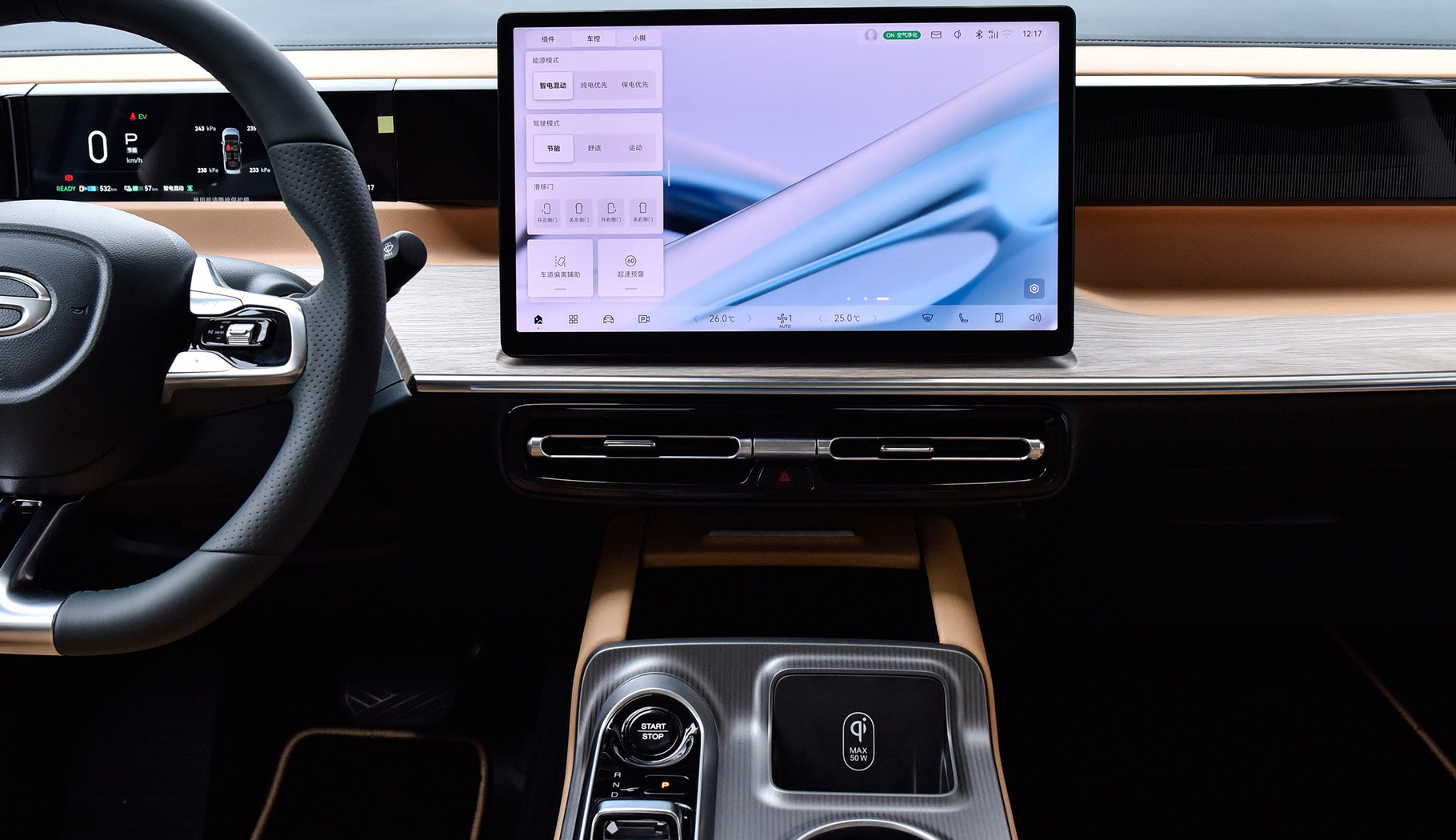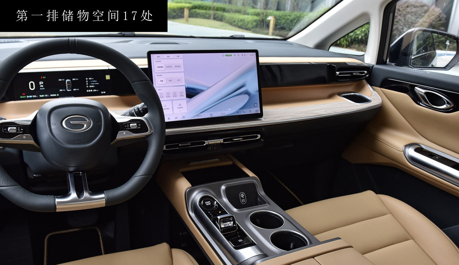 中控岛的设计让我比较满意,表面采用拉丝面板设计,各个布局设计合理,左侧由无钥匙启动按键、驻车按键、档把组成,值得一提的是该车档把设计小巧精致,用手指头即可拨动,对于女性用户来说比较友好,同时也不占太大空间。右侧由手机无线充电座舱和两个杯架组成,该无线充电座舱有别于其他车型上的无线充电面板,只需将支持无线充电功能的手机放入座舱内,即可充电,最大支持50W快充。如何您的手机不支持无线充电也可以将手机放入座舱内,当做普通的手机槽,不用担心当车辆转弯时由于惯性将手机甩出去,影响行车安全。