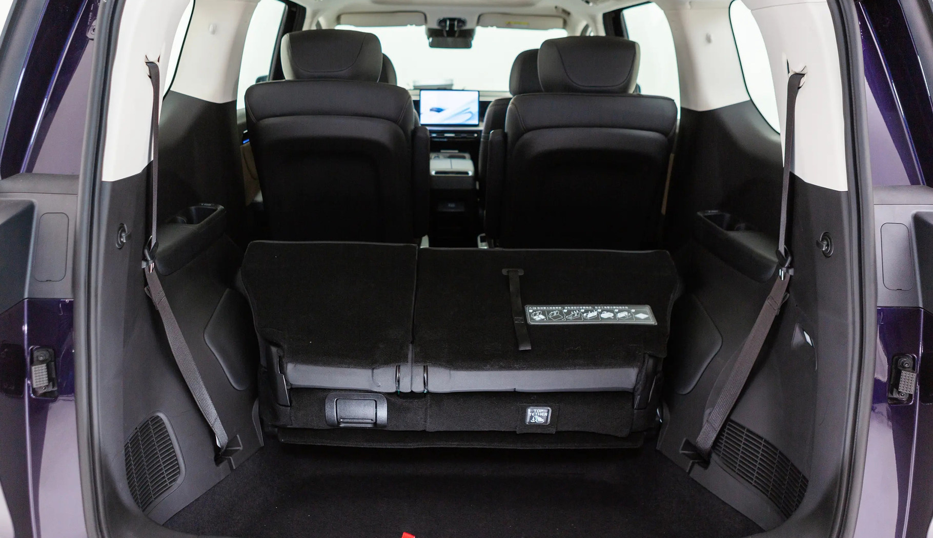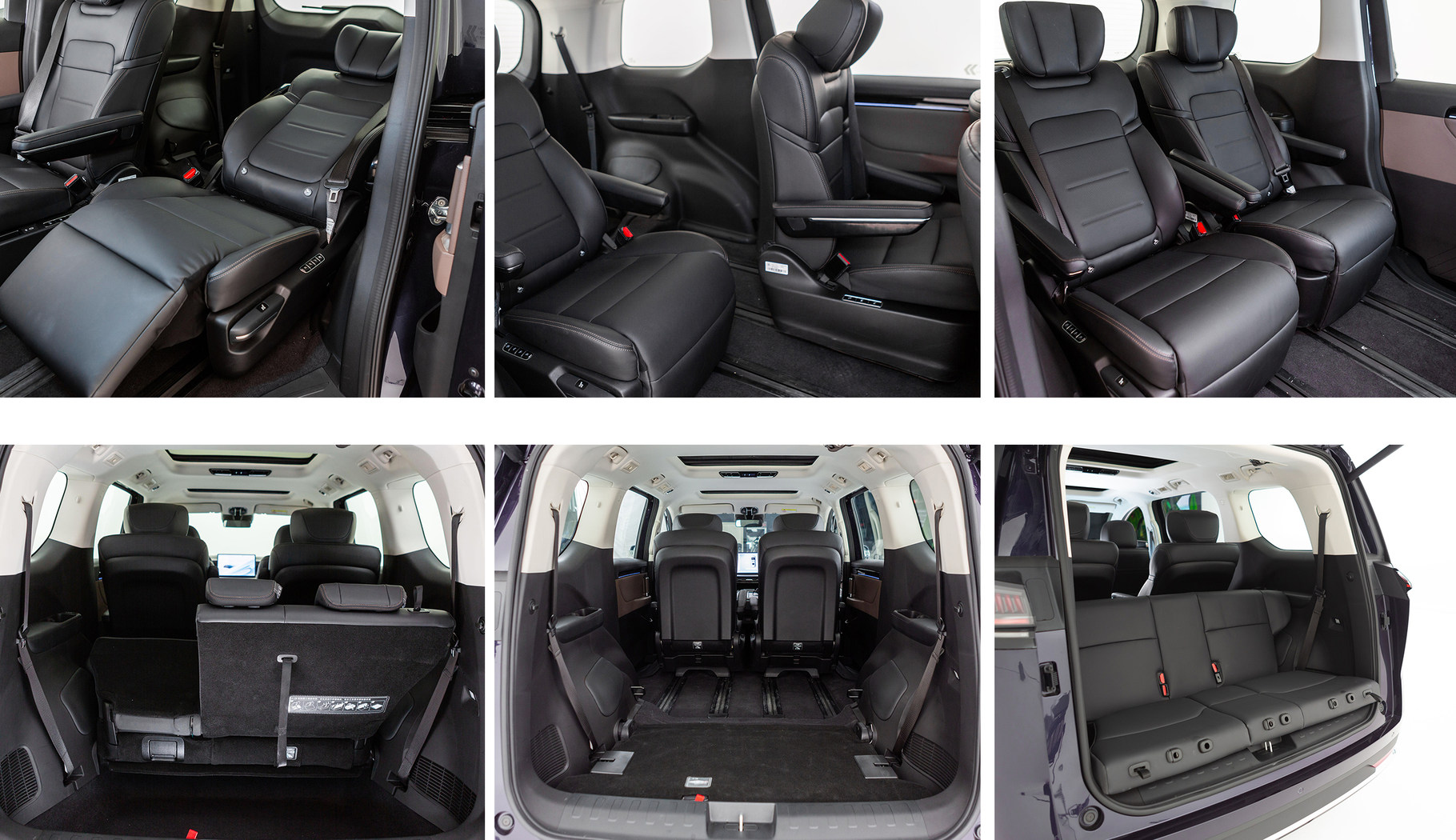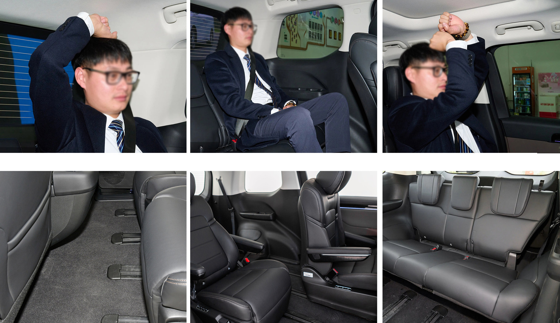 以我本人为例,我的身高为173厘米,体重138斤,属于中等身材,乘坐于主驾驶位,头部空间约有两拳左右,腿部操控空间和腿部活动空间较大。保持第一排座椅不动,来到第二排,采用的是两个独立座椅设计,座椅支持前后630mm超长滑轨,可向前或向后移动,提升乘坐空间,另外还支持左右移动,向内侧移动的话,两个座椅挨在一起,形成接近连座的座椅,比如说宝妈和孩子乘坐在第二排,就可以将座椅并拢,方便照顾。此外,前面提到的座椅支持630mm的超长滑轨,当车辆在调整成大四座之后,第二排座椅可以充当“躺椅”使用,同时配备了“零重力座椅”功能,腰部零压角为127度和腿部零压角为133度,符合人体工程学设计原理。第三排座椅采用可以乘坐三个人,每个座椅均配备了头枕,头部距离车顶剩余空间约有一拳三指,腿部距离第二排座椅约有两拳左右,且座椅靠背角度支持向后调节,长途乘坐时,可以以躺坐的姿态休息,除了提升后排的空间感之外,舒适度也得到不错的提升。