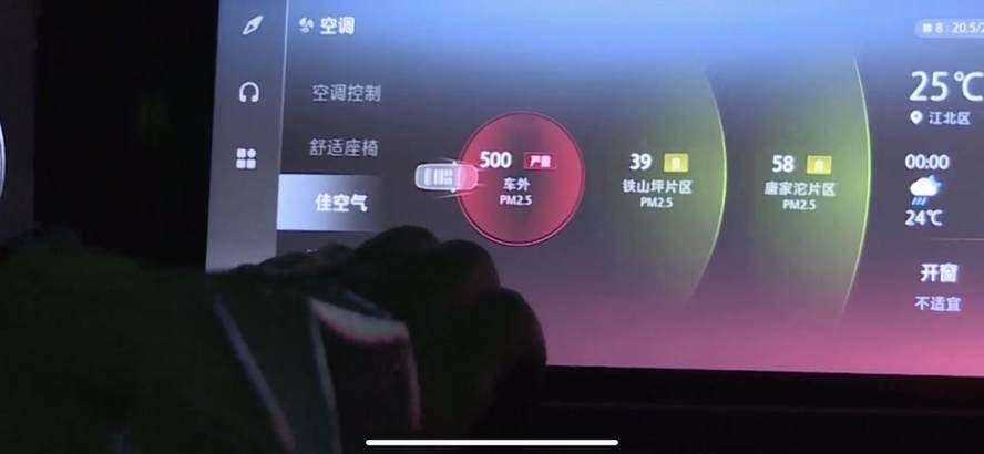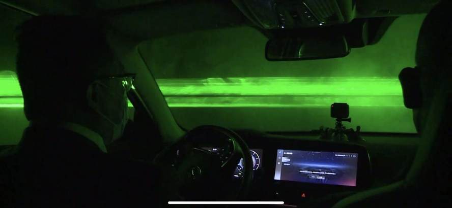 而激光之所以穿过车身而没有在车内留下痕迹,主要是由于车内的车辆内的新风系统将空气中烟雾形成的颗粒过滤之后的成效。而当车门打开后,烟雾迅速弥漫,车内空气的PM2.5数值迅速飙升到了500,而两位体验官穿上防护服进入车内并打开车内循环系统之后,在短短的几分钟之内烟雾以肉眼可见的速度迅速被净化,实验效果非常明显。
