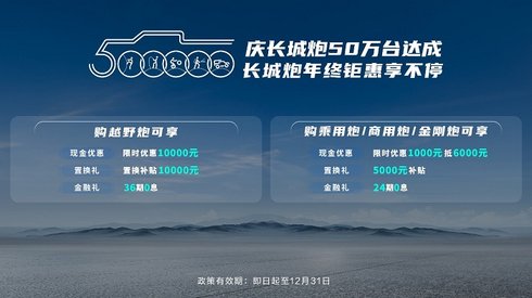 年末将至,长城炮年终钜惠重磅来袭:即日起至12月31日,购买山海炮乘用版、山海炮性能版、越野炮、乘用炮、商用炮、金刚炮、弹系列等车型,均可享受不同程度的优惠福利。
