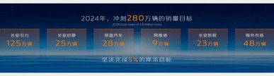 基于“215”战略蓝图,长安汽车制定了“确保市场地位、夯实品牌立位、做实技术占位”的总体策略,2024年长安汽车将联手战略合作伙伴打造可持续领先的智能化尖点技术,加快拓展海外市场构建全球布局。全力冲刺280万辆的销量目标,其中,长安引力125万辆,长安启源25万辆,深蓝汽车28万辆,阿维塔9万辆,长安凯程23万辆,海外市场48万辆。