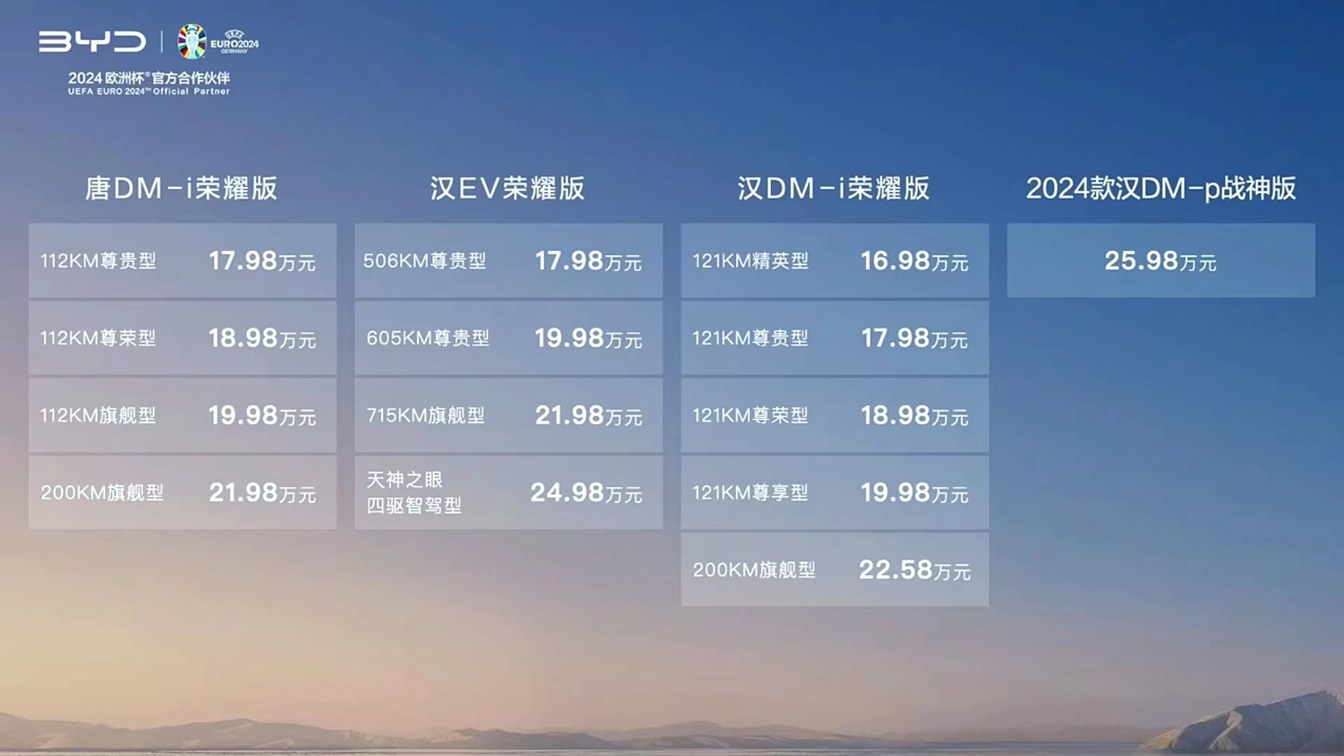 2024年2月28日,比亚迪汉/唐荣耀版车型正式上市。其中,汉EV荣耀版共4款车型,售价17.98~24.98万元;汉DM-i荣耀版共5款车型,售价16.98~22.58万元;2024款汉DM-p战神版共1款车型,售价25.98万元;唐DM-i荣耀版共4款车型,售价17.98~21.98万元。