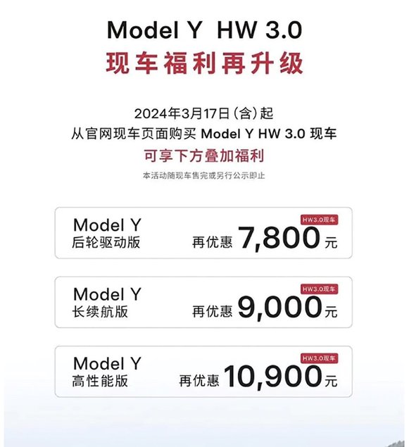 这次降价的车型是Model Y的HW3.0车型,也就是说老款的库存车型。从去年年底开始,Model Y就升级了HW4.0,也就是增强驾驶辅助的版本,算力、摄像头都有提升。