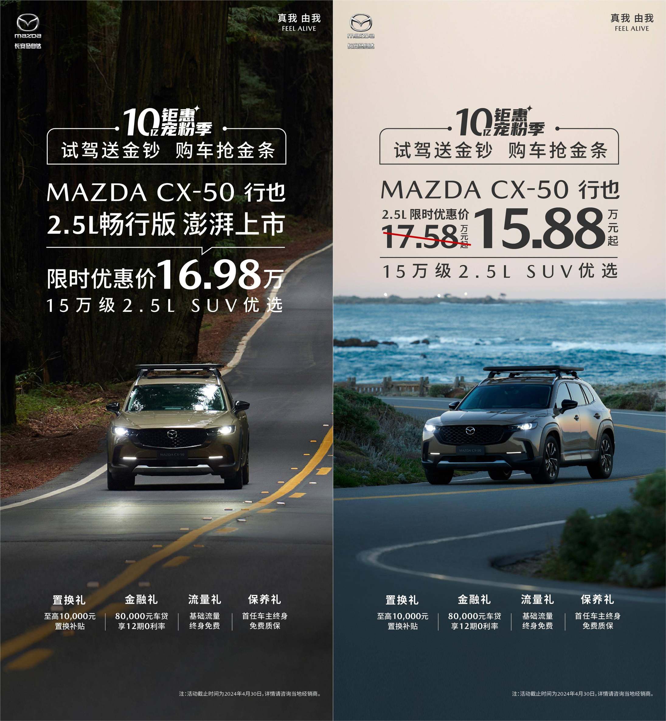 3月16日,配合长安马自达官方“10亿钜惠宠粉季”促销政策活动,CX-50行也全系车型限时直降1万元。其中2.0L车型14.98万起,2.5L悦行版钜惠17,000元,起售价仅为15.88万元,成为15万级SUV最大动力爆款车型,刚刚上新的2.5L畅行版也限时售价16.98万元起,让消费者在低价享受“大排量”的同时,也能低价享受豪华和舒适。
