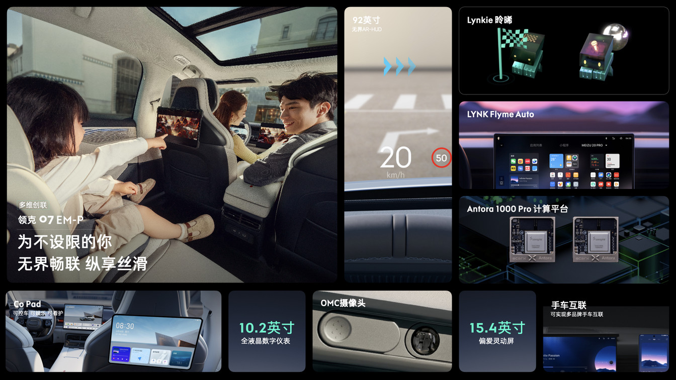 作为年轻态数字化原住民,领克的用户追逐最前沿的智能科技体验。领克携手魅族,打造LYNK Flyme Auto领克智能座舱系统。领克07 EM-P搭载安托拉1000 Pro计算平台,集成2颗7纳米“龍鷹一号”芯片,单颗算力是高通8155芯片的2倍。这是中国第一块,自研车规级7纳米量产芯片,为多屏畅联,提供强大算力保障。配合无界畅联的“智慧大屏全家桶”,07 EM-P可实现92英寸AR-HUD、15.4英寸偏爱灵动屏、10.2英寸全液晶数字仪表、以及Pad、手机“3+2+1”多屏畅联体验。