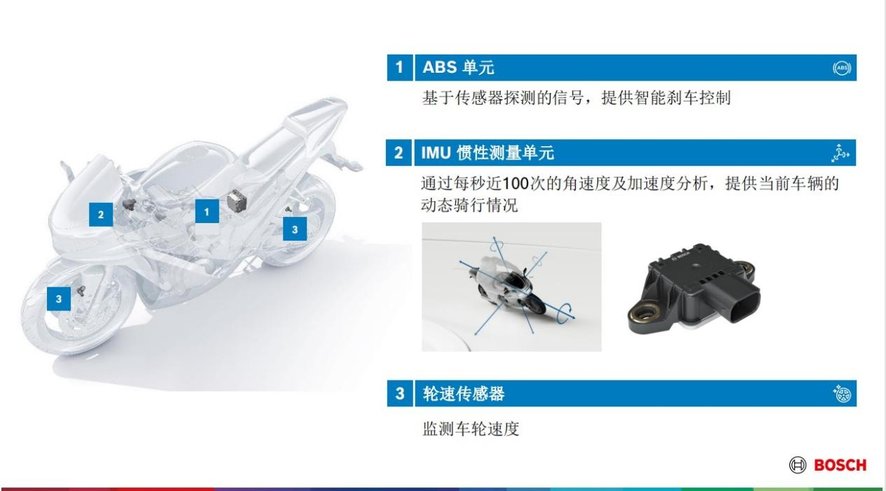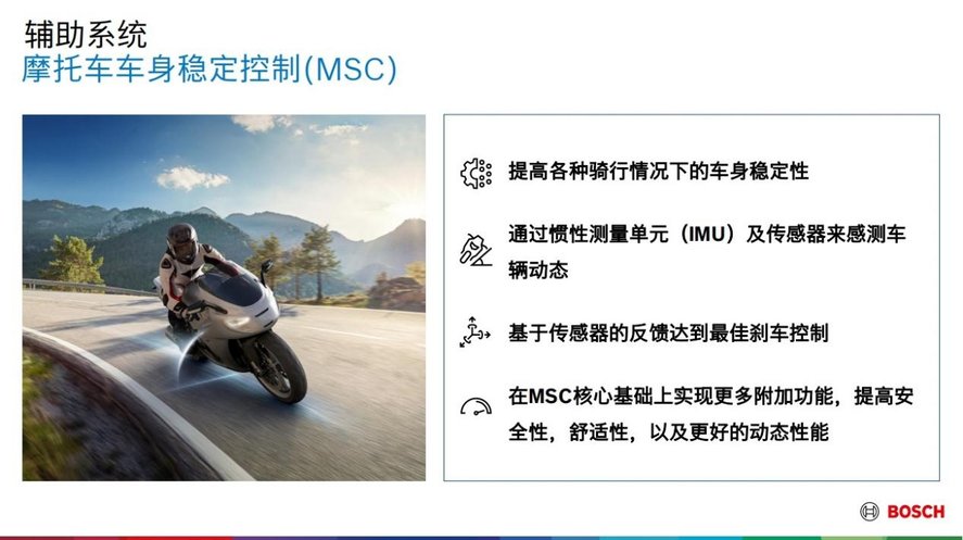 博世摩托车车身稳定控制系统 MSC 能够更进一步提高骑行的安全,轻松应对骑行中可能遇到的弯道、雨天湿滑路面等各种复杂的工况。摩托车车身稳定控制(MSC)能够提高各种骑行情况下的车身稳定性。通过惯性测量单元(IMU)及传感器来感测车辆动态,基于传感器的反馈达到最佳刹车控制。在 MSC 核心基础上实现更多附加功能,提高安全性,舒适性,以及更好的动态性能。基于惯性测量单元 IMU 提供的每秒近100 次的车辆加速度和角速度分析,以及轮速传感器提供的前后轮转速差等信息,博世 MSC 可以在骑行过程中调节摩托车节气门开度,进而控制发动机扭矩输出,保证车身稳定,从而显著避免或减轻道路交通伤害。也能为车辆带来例如近年来备受关注的牵引力控制、弯道刹车控制、以及翘头控制等附加功能。