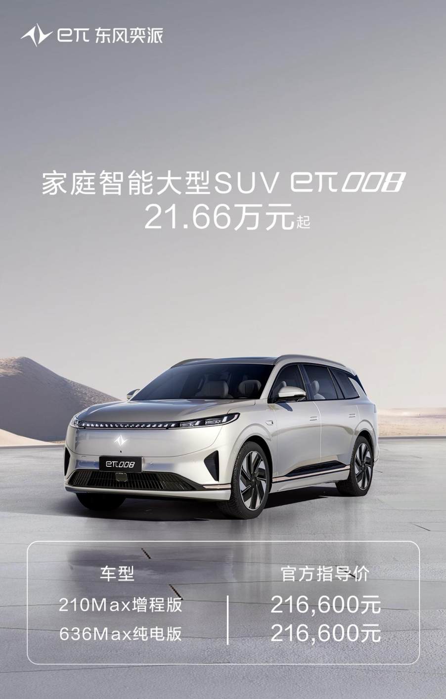 2024年6月14日,东风奕派eπ008正式上市,共有210Max增程版和636Max纯电版,两个版本,其官方指导价均为21.66万元。东风奕派eπ008,定位6座中大型SUV,提供纯电和增程两种动力选择。