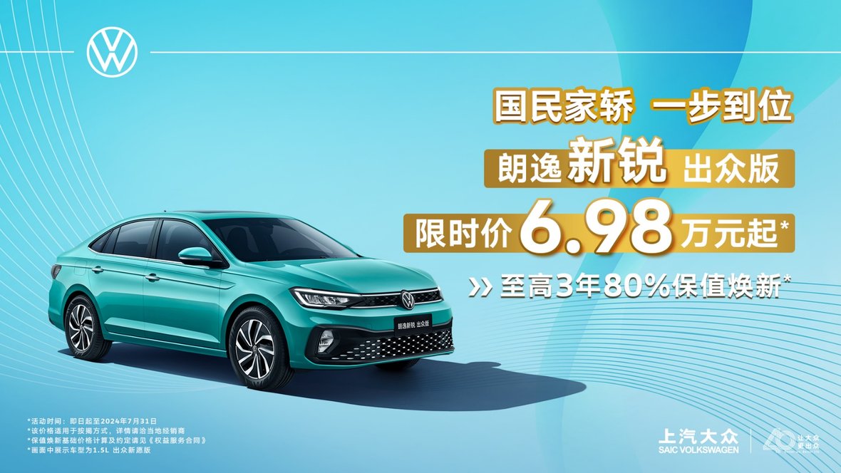 不到7万即可坐拥远超500万用户认证的“新品质国民家轿”?上汽大众暑期“放价”第三弹,朗逸新锐出众版限时优惠6.98万起,价格再下探;配合至高3年80%保值焕新权益,三年残值率高达80%,再次打破拥车成本门槛。以更“出众”的性价比、质价比,成就一步到位的用车选择。