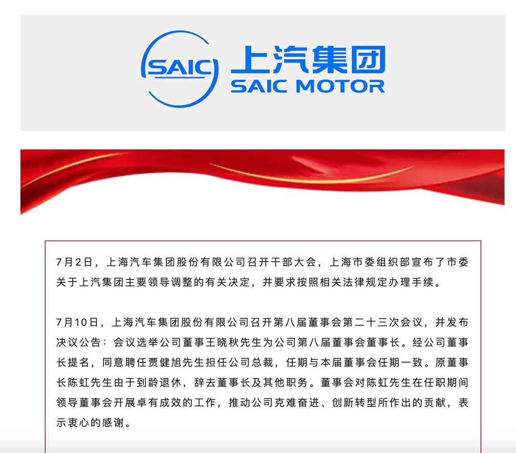 7月10日,上海汽车集团股份有限公司完成舵手更换。上汽集团发布公告称,上汽集团董事长陈虹到龄退休,辞去董事长及其他职务。董事会会议选举公司董事王晓秋为公司第八届董事会董事长,并聘任贾健旭担任公司总裁,任期与本届董事会任期一致。