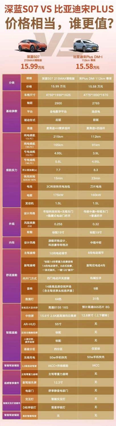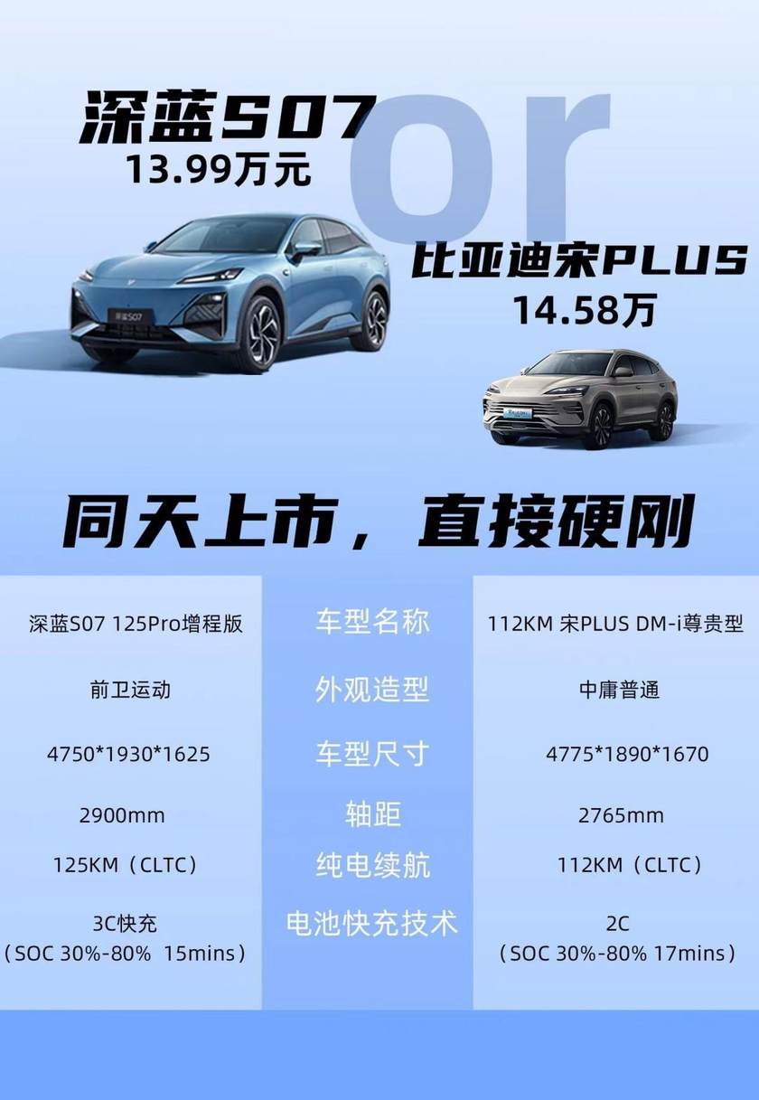 深蓝S07与比亚迪宋Plus DM-i的同步上市,无疑为中国品牌SUV市场注入了新的活力。两款车型各有千秋,形成了良性的竞争关系。宋Plus DM-i作为插混SUV的领导者,其市场地位难以撼动;而深蓝S07则凭借左手深蓝超级增程右手华为乾崑智能的双重优势,有望在新的市场格局中占据一席之地。