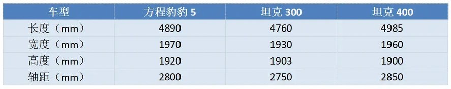 尺寸方面,方程豹豹5长宽高分别为4890/1970/1920mm,轴距为2800mm,虽然定位是中型SUV,但实际尺寸已经比较接近中大型SUV车型。比坦克300稍微大一些,但又比坦克400小一点。