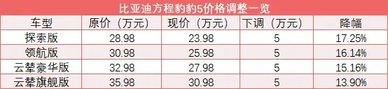 7月29日,比亚迪方程豹汽车官方发布了豹5价格调整的消息,原本售价为28.98万-35.28万元的方程豹豹5官降5万元,降价后售价为23.98万-30.28万元,价格调整的速度和幅度,都让人猝不及防。