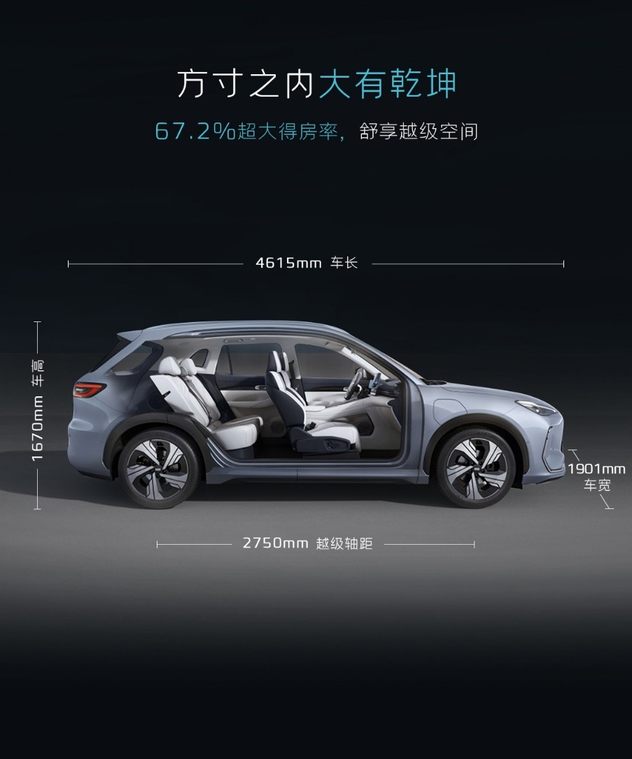 吉利银河E5拥有A级车的4615×1901×1670mm车身尺寸和2750mm的轴距,却带来B级车的空间体验。高达67.2%的超大“得房率”,1891mm的舱内有效车长,让身高1.8m的乘客坐在后排,也能随意翘起二郎腿。车内使用面积可达4.03㎡,比同级多一张办公桌的面积。