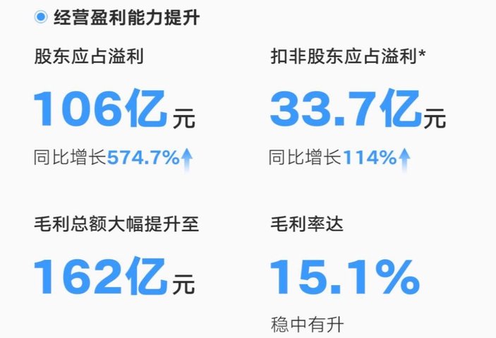 最终呈现出来的数字来看,2024年上半年,吉利汽车集团经营盈利能力提升,股东应占溢利同比大幅增加,上半年股东应占溢利106亿元,同比大增574.7%;实现扣非股东应占溢利33.7亿元,同比增长114%。此外,其净现金水平上升25.4%至357亿元创历史新高,现金储备充裕稳健。