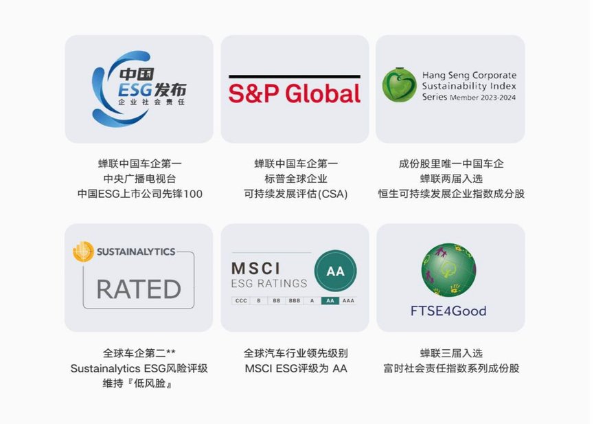 2024年7月,吉利汽车入选“中国ESG上市公司先锋100”榜单,位列第八,蝉联中国车企第一,且是汽车行业唯一获得“五星级”卓越评价的企业;在标普全球可持续发展评估中,吉利连续获得中国车企第一的荣誉;成为唯一入选恒生可持续发展企业指数的中国车企;吉利汽车连续三届入选富时社会责任指数系列成份股;在MSCI ESG评级中获得了AA级,在全球汽车行业中属于领先级别;吉利汽车维持ESG「低风险」评级,在全球车企中排名第二……