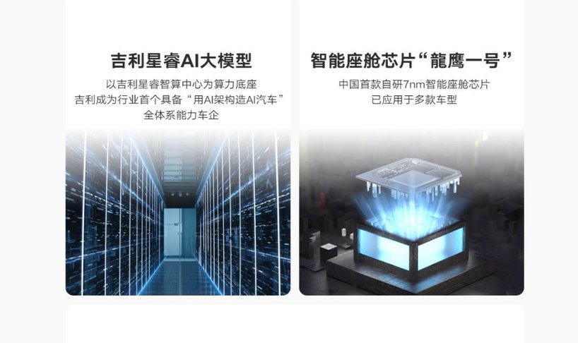 人工智能上,以吉利星睿智算中心为算力底座的自研基础大模型,吉利星睿AI大模型正式发布,吉利成为行业首个具备“用AI架构造AI汽车”的全体系能力的车企。中国首款自研7nm智能座舱芯片“龍鷹一号”,应用于多款车型。