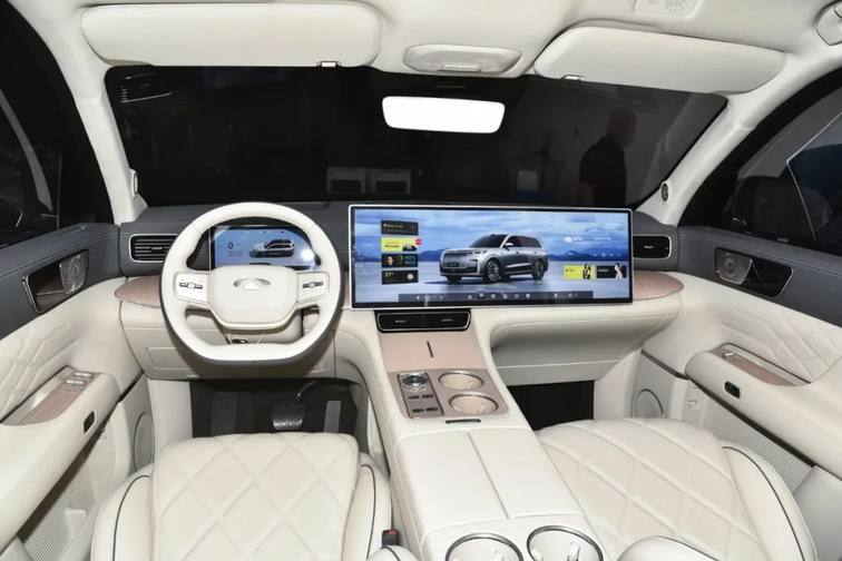 内饰方面,风云T11前排的30英寸一体式大联屏相当醒目,后排也配备了17.3英寸的娱乐屏。另外,新车采用平底式方向盘,以及怀挡式换挡机构。全车采用了大面积皮质包裹,中控台、车门等细节加入木纹装饰。