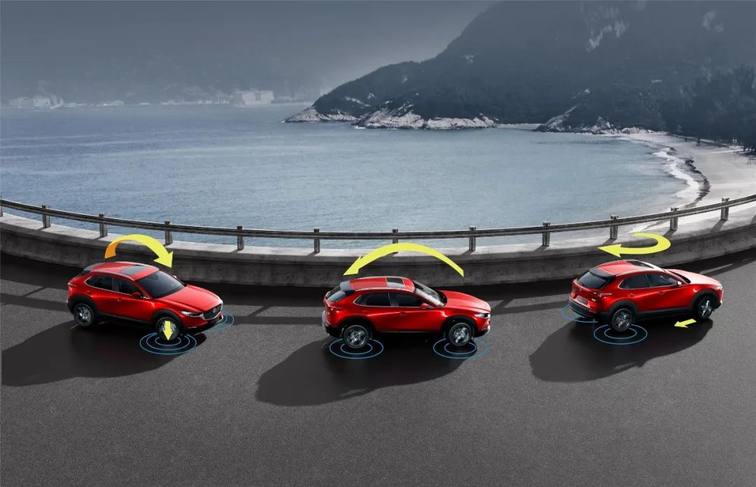 而GVC Plus在原有的基础上增加了依靠制动器进行的姿势稳定化控制的功能。举个例子,在快速左转弯的时候,如果车辆有转向不足的趋势,CX-30就会给左后轮施加一点制动力。如此一来,就会形成一个以左后轮为中心的逆时针旋转力矩,把推出去的车头给拉回来。如果出现转向过度,也可以按照这个原理反向操作。