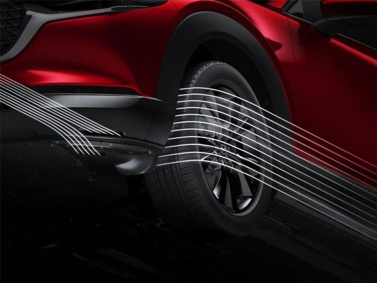 而且CX-30还拥有堪比豪华车的底盘平整度,在前轮和后轮的附近,各自有一块扰流板,降低了空气流经悬挂系统时的内循环阻力。如此一来,CX-30便拥有了非常优秀的底盘风阻,既能够降低油耗,也能形成更大的下压力,提升行驶稳定性。