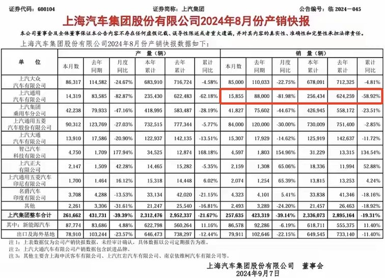 据上汽集团产销公报显示: