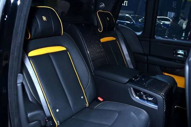 库里南Black Badge配备了22英寸五辐花瓣形拼色轮圈,同时除了轮圈外,新车的红色卡钳都难得可贵的带有RR Logo。同时,劳斯莱斯经典的纯手工绘制的“黄金腰线”也出现在了库里南Black Badge身上,从车头贯穿到车尾,除了起到点缀的用途外,也将是身份的一种象征。