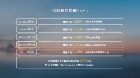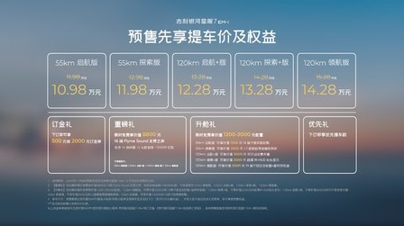 即日起至新车上市正式售价公布当日,用户可通过吉利银河APP、微信小程序、抖音小程序及官网等官方渠道下订,下订用户可享500元订金抵2000元订金劵、限时免费享价值8800元的Flyme Sound无界之声、限时免费享价值1200-3000元配置以及优先提车权等丰厚权益。