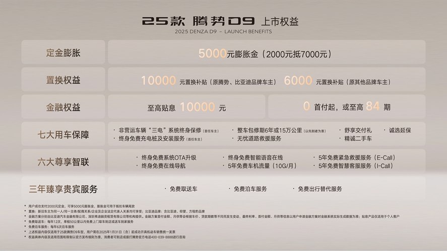 为感谢新老用户的支持和信赖,即刻下订25款腾势D9,尊享超凡权益!包含5000元膨胀金、至高10000元置换补贴、至高贴息10000元,以及0首付或至高84期灵活金融权益方案!还有终身免费三电质保、终身免费充电桩及安装服务、终身免费系统OTA升级,更有5年免费车机流量等限时尊享,下订即可锁定诚意十足的尊贵席位!