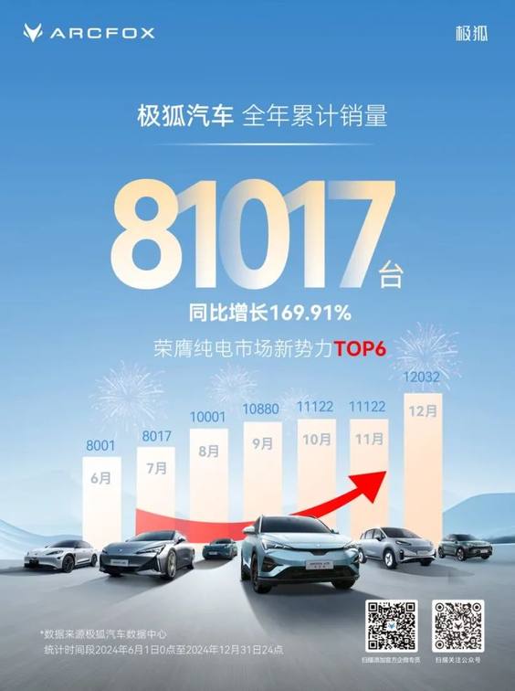 2024年,中国新能源汽车行业在全球舞台上展现出前所未有的活力与竞争力。其中,北汽极狐全年销量超8.1万辆,同比增长170%,荣膺纯电市场新势力TOP6,成为新能源汽车舞台上最为亮眼的存在之一。同时,北汽与华为携手打造的全景智慧旗舰轿车享界S9,连续5个月成为40万以上纯电豪华轿车销冠,成为纯电豪华市场的新标杆。