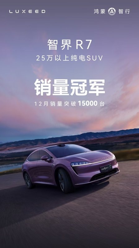 智界R7纯电版12月销量突破15000台!新能源SUV市场新标杆