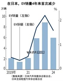 日本经济新闻(中文版:日经中文网)以汽车销售公司的业界团体9日发布的国内销量为基础进行了统计。2024年纯电动乘用车的国内销量(包括轻型汽车,不包括货车等)比上年减少33%,降至5万9736辆,时隔4年再次转为减少。