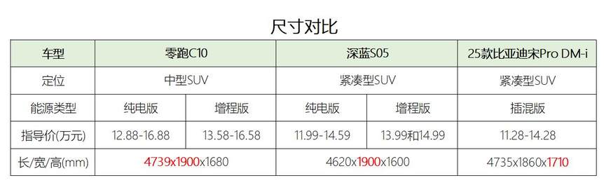 三台车中,零跑C10定位中型SUV,深蓝S05和比亚迪宋Pro DM-i定位紧凑型SUV。尺寸对比可见,零跑C10的长度、宽度均较长,而宋Pro车高较高。