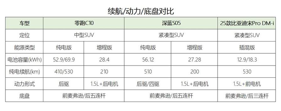 对比零跑C10和深蓝S05,无论是增程版还是纯电版,零跑C10提供更大的电池容量和纯电续航,成本更高。