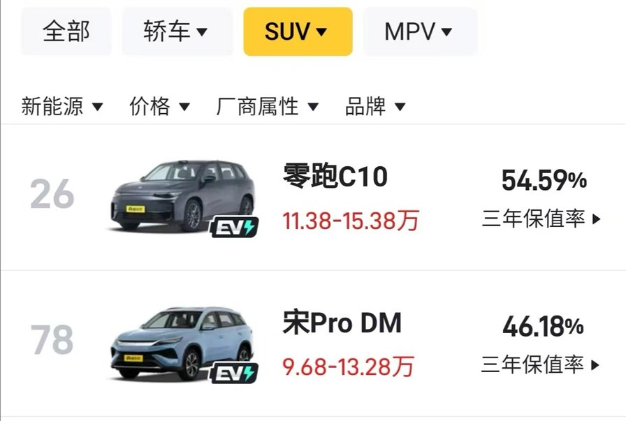 通过查询发现,零跑C10三年保值率为54.59%,宋Pro DM-i三年保值率为46.18%,深蓝S05去年10月份才上市,暂时没有保值率数据。