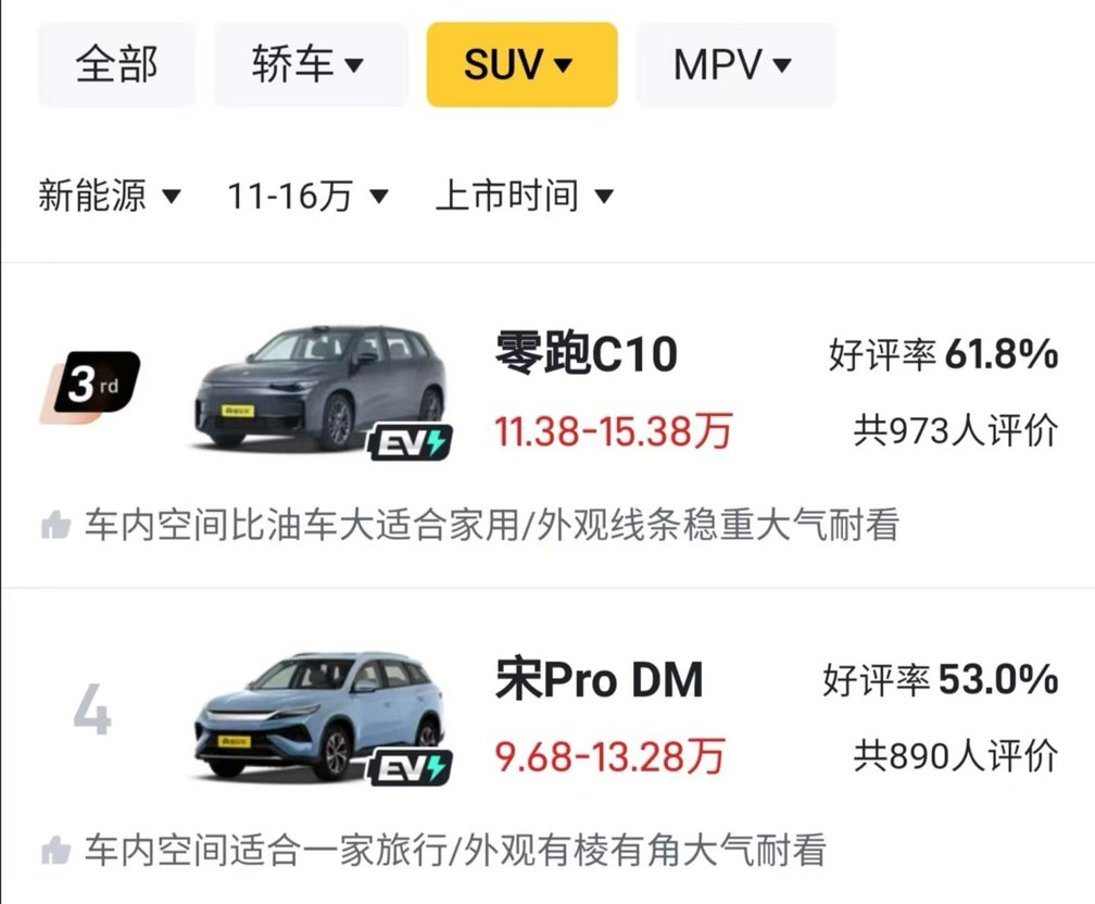 用户口碑方面,零跑C10车主好评率为61.8%,宋Pro DM-i车主好评率为53%,深蓝S05暂无数据。