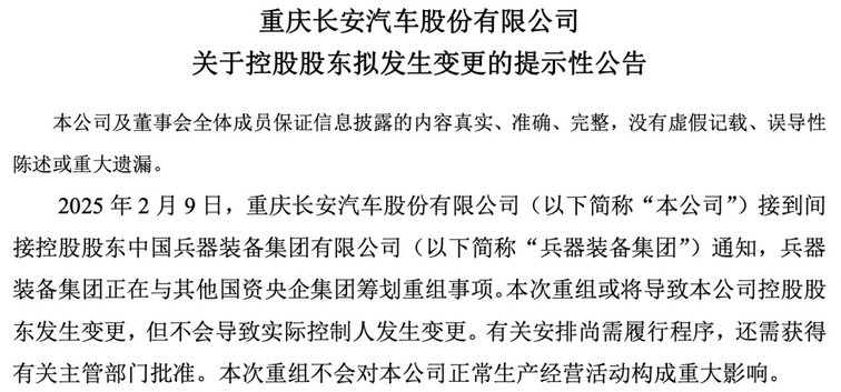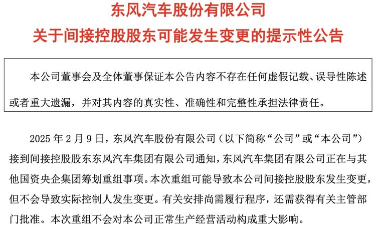 2月9日傍晚,长安汽车与东风股份两家A股上市公司发布最新公告显示,长安汽车和东风汽车的间接控股股东——中国兵器装备集团和东风汽车集团有限公司,均宣布正在与其他国资央企筹划重组事项,可能导致控股股东变更,但实际控制人仍为国务院国资委,且不会对正常生产经营构成重大影响。