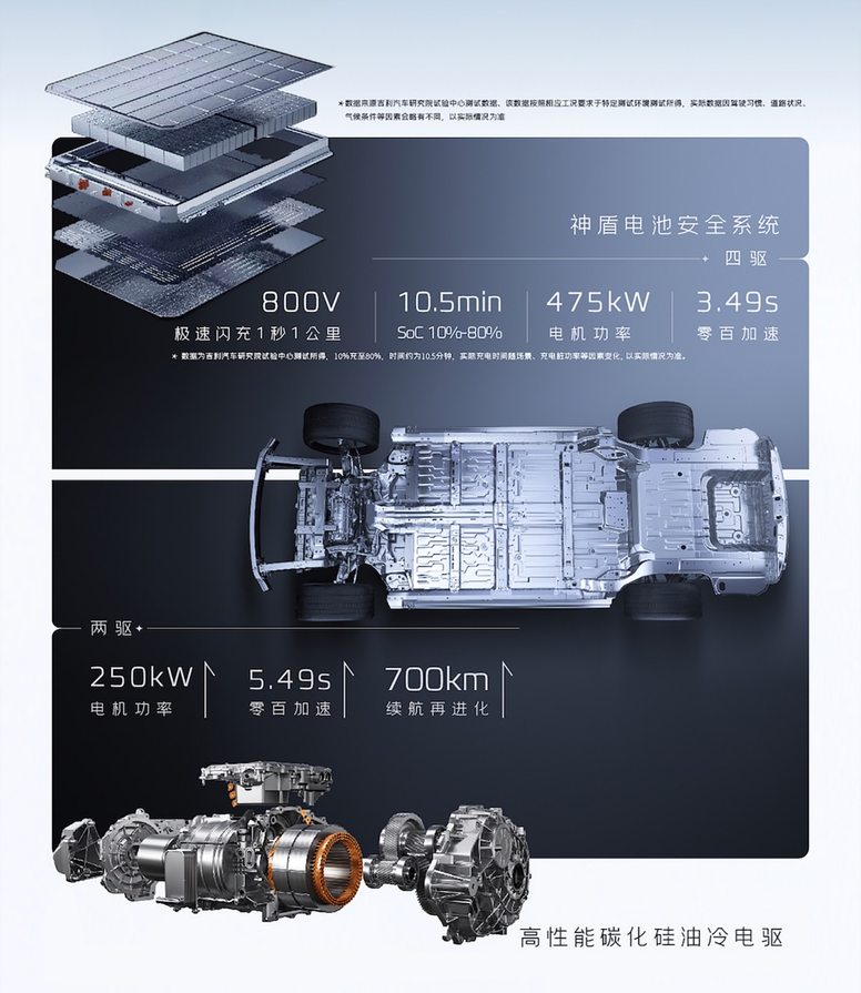 在纯电车型最为核心的“三电”系统上,银河E8也实现了全面升级。新车采用了同级领先的SiC油冷电驱和全新宁德时代电池,最高充电倍率达到5.5C,充电8分钟即可续航300公里。800V四驱版车型综合功率达到475kW,零百加速仅需3.49秒,后驱版车型续航最高可达700公里,四驱版续航最高为620公里。